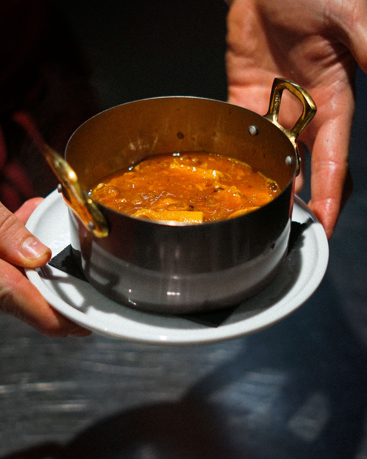 Puerro asado, jamón ibérico, crema de ajo, almendra tostada y lascas de Idiazabal (según temporada)